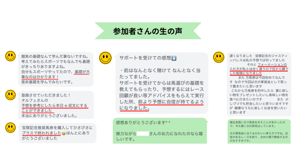 A:競馬予想や馬券術を中心に「万馬券を自力でGETできるようになる」ためのコンサルとなります。電話サポートやLINEでのやりとりを通して劇的に進化していってもらいます。テキストでわからないところなどは遠慮なく質問してください。テキストで勉強するのはもちろん良いですが、ミーティングを活用することでより早く結果を出すことができます。LINEもどんどん送ってもらって結構です。